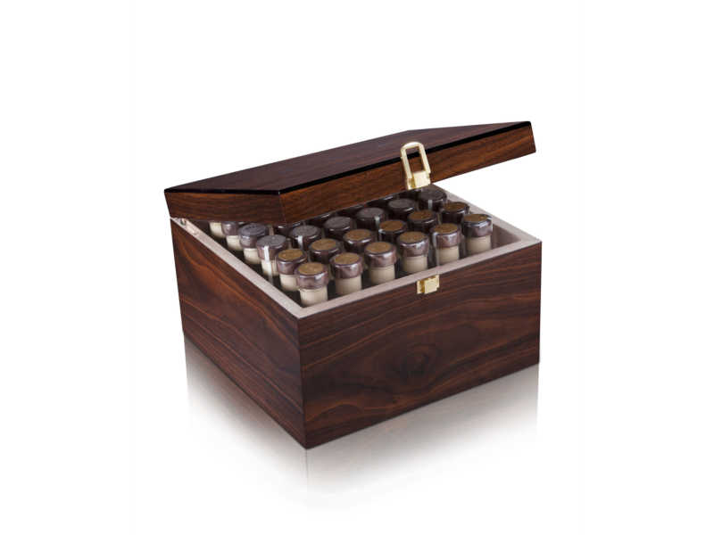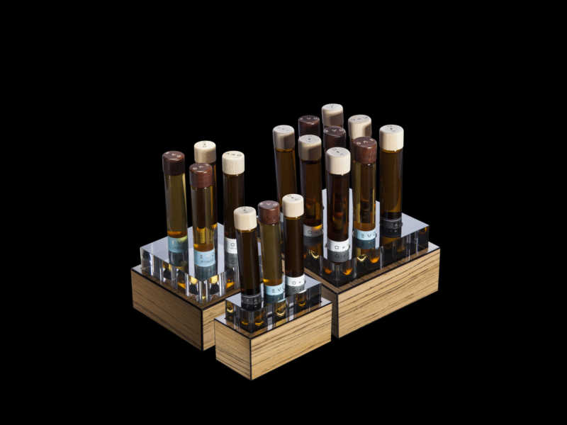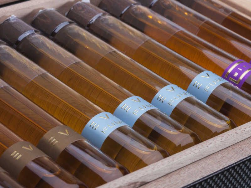 Non v’è dubbio che le grappe EVO siano un abbinamento perfetto con un buon sigaro. Da qui l’idea di proporre una modalità di confezionamento che sia al tempo stesso un’alternativa alla mescita tradizionale (dalla bottiglia), faciliti la scelta fra i prodotti della gamma o la possibilità di effettuare piccole “degustazioni” e consenta la creazione di confezioni regalo “diverse”, modulabili ed intriganti. Eccoci quindi a giocare con questo mondo utilizzando “anilla”, portasigari ed humidor di vari formati. Un sigaro di EVO è una provetta in vetro monodose il cui contenuto (5 cl.) è la quantità perfetta per un bicchiere. Vengono commercializzati in casse di legno miste da 100 o in scatole miste o mono prodotto da 36 sigari.