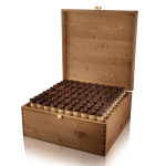 Cassa portasigari in legno contenente 100 provette in vetro mono-dose (“sigaro”) dei tre distillati EVO.